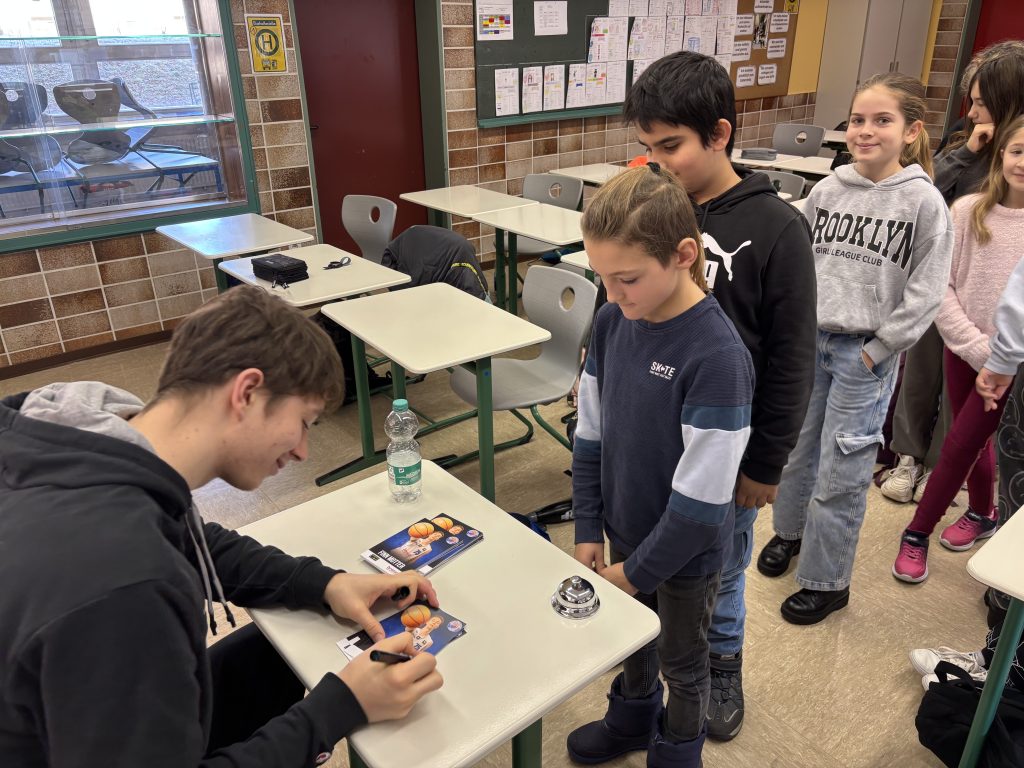 Nach der Sport- und der Basketballeinheit trafen sich dann alle Schüler zur gemeinsamen Verabschiedung in der Turnhalle. Alle waren sich einig – Lesen macht Spaß, und gemeinsam mit sportlichen Aktivitäten wird daraus ein unvergessliches Erlebnis. Natürlich gaben die Profis dann auch noch geduldig Autogramme und standen für Fotos zur Verfügung. Fredi Speidel, Organisator vom BBC Coburg, hatte auch noch eine Überraschung im Gepäck: Alle Kinder wurden zu einem Heimspiel des BBC Coburg eingeladen. Zudem wies er auf die Trainingszeiten des BBC Coburg hin. Interessierte Kinder können gerne vorbeikommen und in die Sportart Basketball hineinschnuppern. Was hat aber nun Basketball mit Lesen zu tun? Finn hatte die Antwort darauf: „Ich lese jeden Abend, bevor ich ins Bett gehe. Ich entspanne und schalte so einfach mal ab. Als Profi hilft mir das sehr. Lesen ist generell sehr wichtig – man braucht das im Alltag eigentlich ständig.“